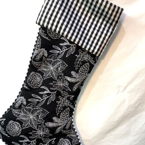 Add a touch of timeless elegance to your holiday decor with these black and white Christmas stockings-8 available. Made from a durable polyester-cotton blend, this stocking features a stunning white jacquard holly pattern on a deep black background—perfect for lovers of classic Christmas charm with a modern twist.