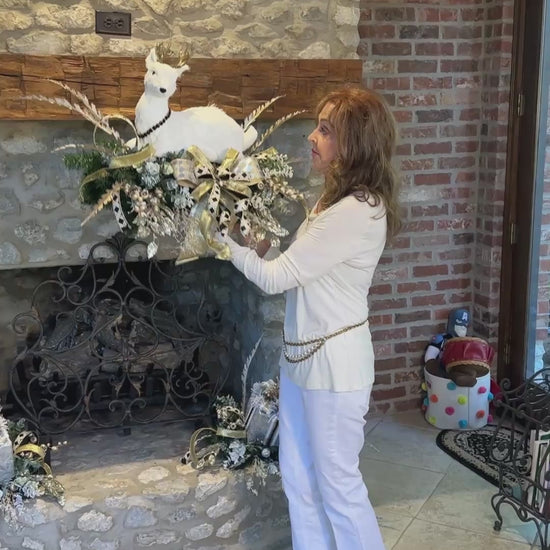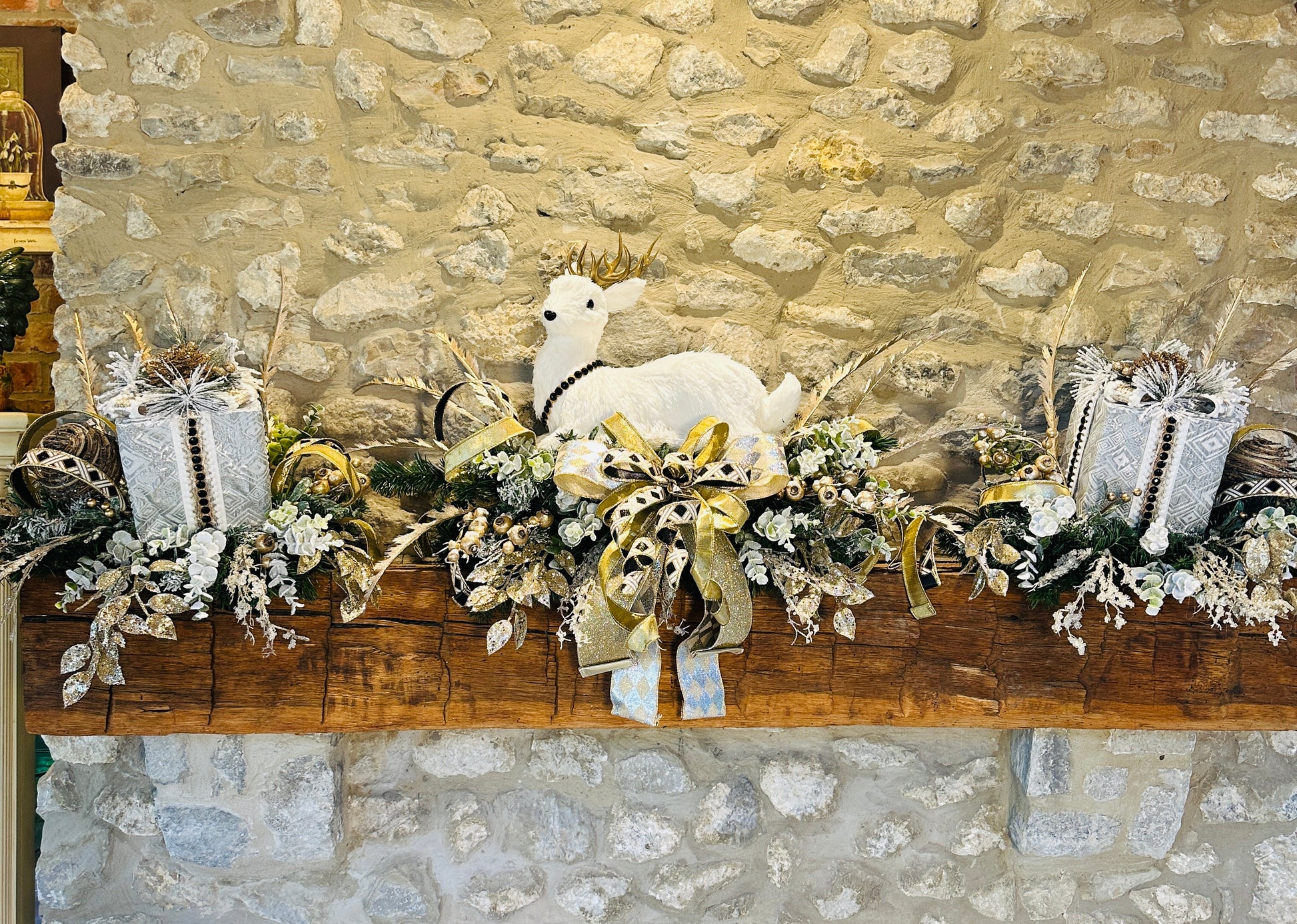 Transform your home into a luxurious winter wonderland with this 3-piece Christmas mantle set, designed for effortless elegance. Featuring a white deer centerpiece surrounded by silver gifts, shimmering gold and black ribbons, icy woodland ornaments, silver glitter leaves and sparkling frosted greenery, this set brings sophistication and warmth to your holiday decor—without the hassle.
