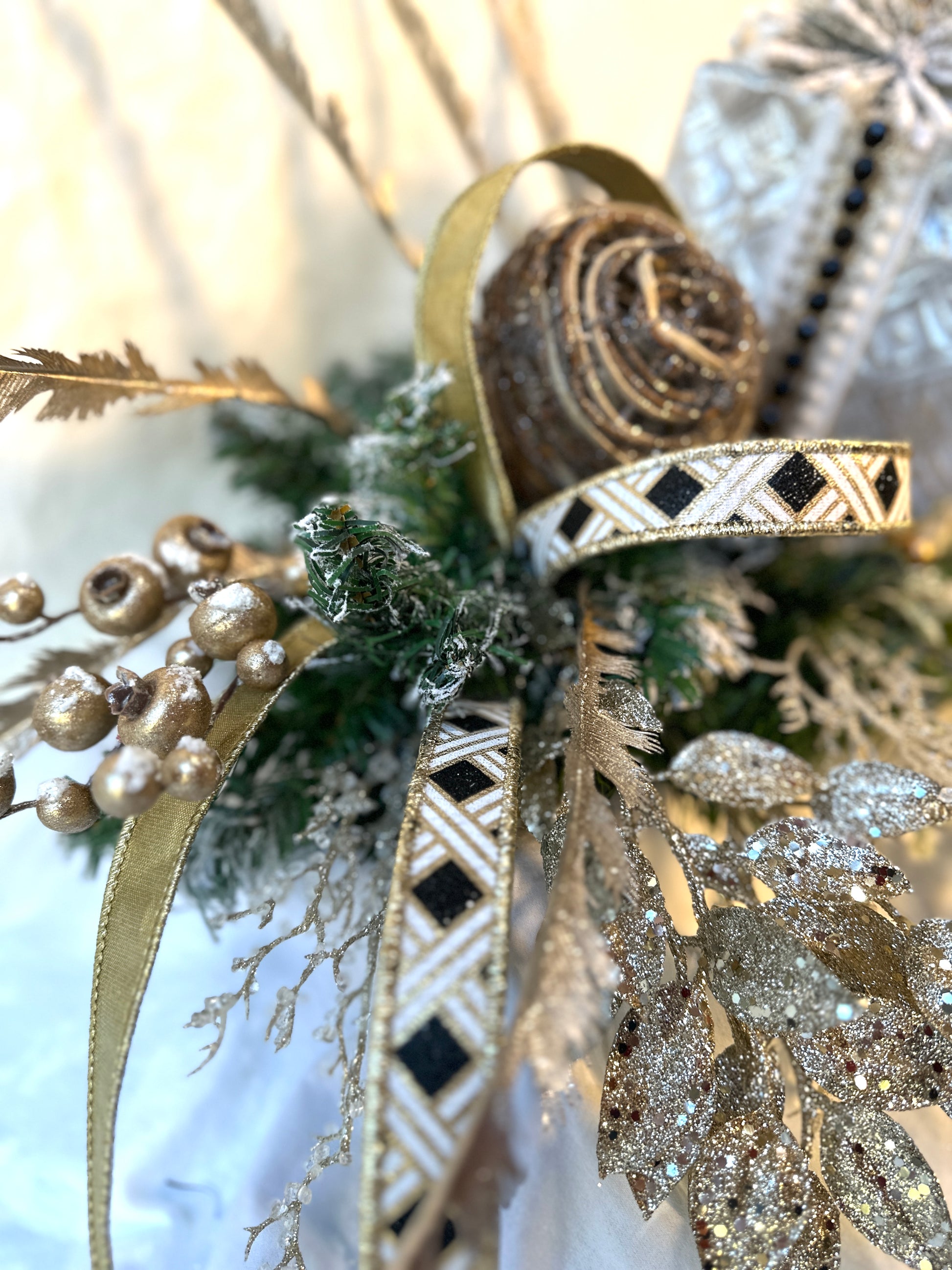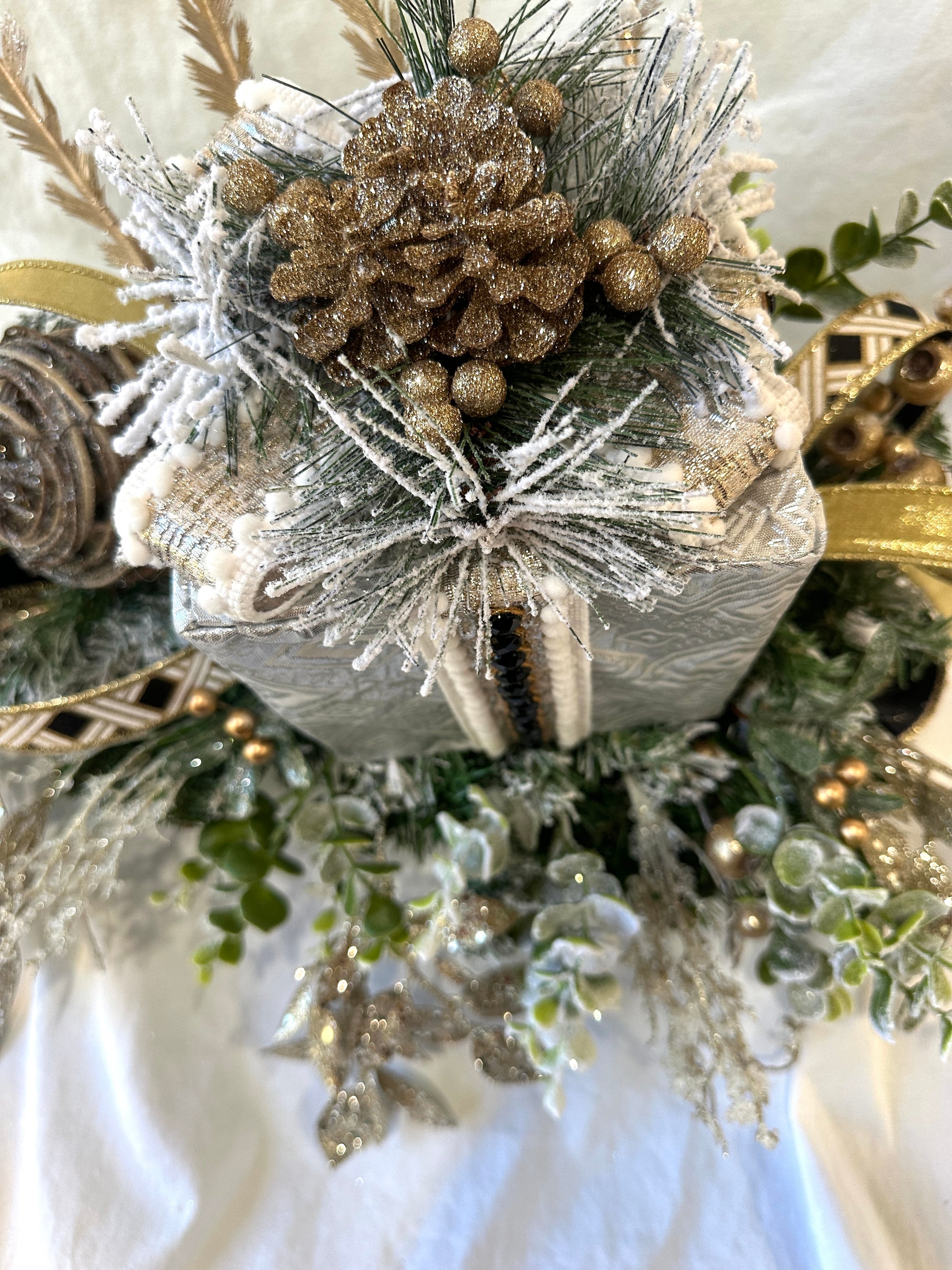 Accented with frosted eucalyptus, silver leaves, gold berries & icicles