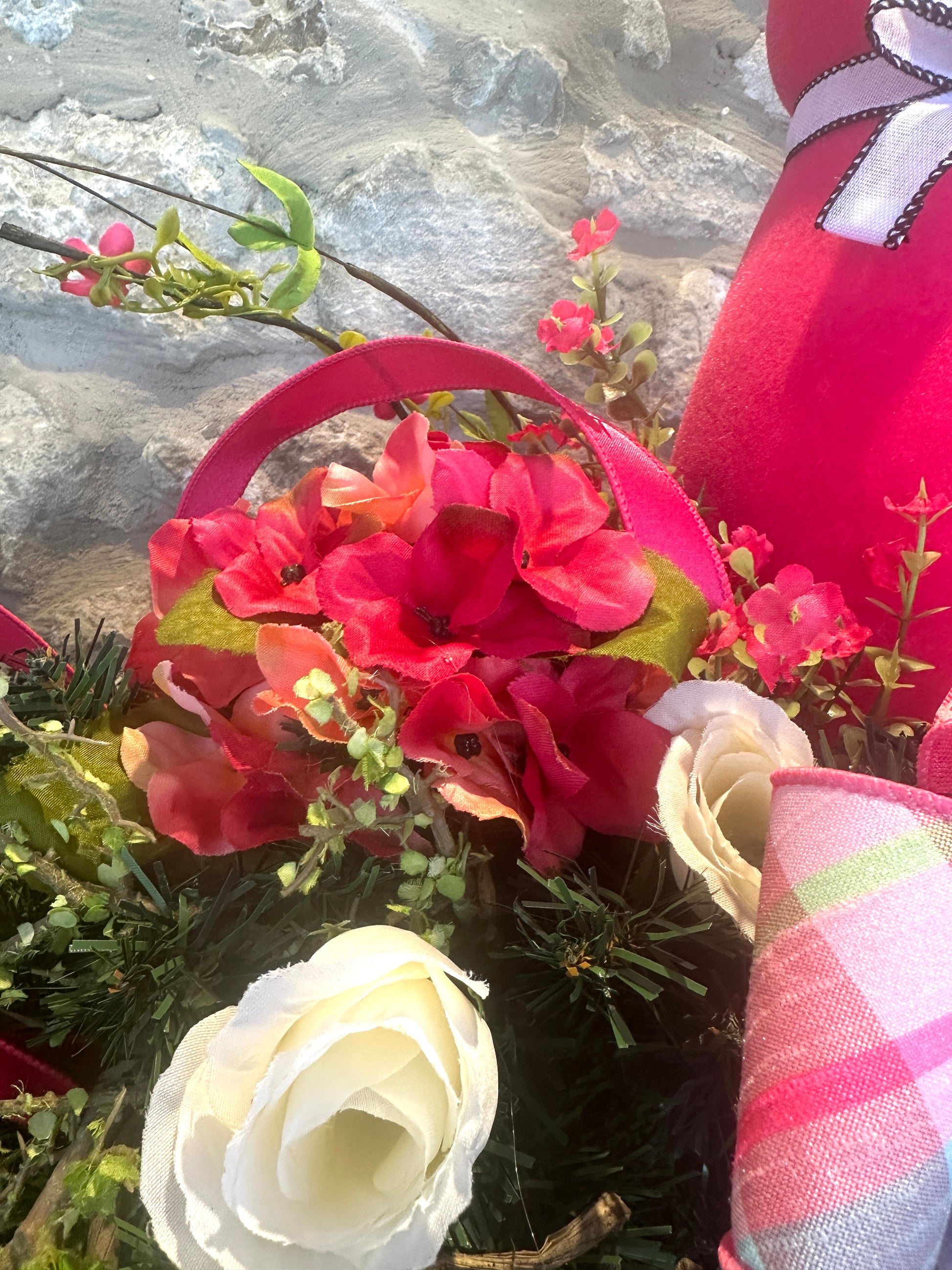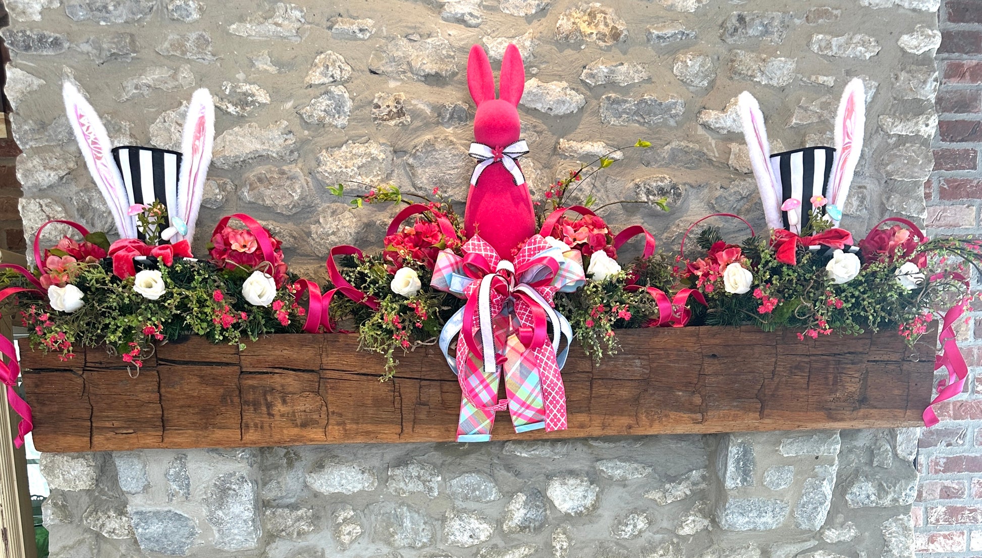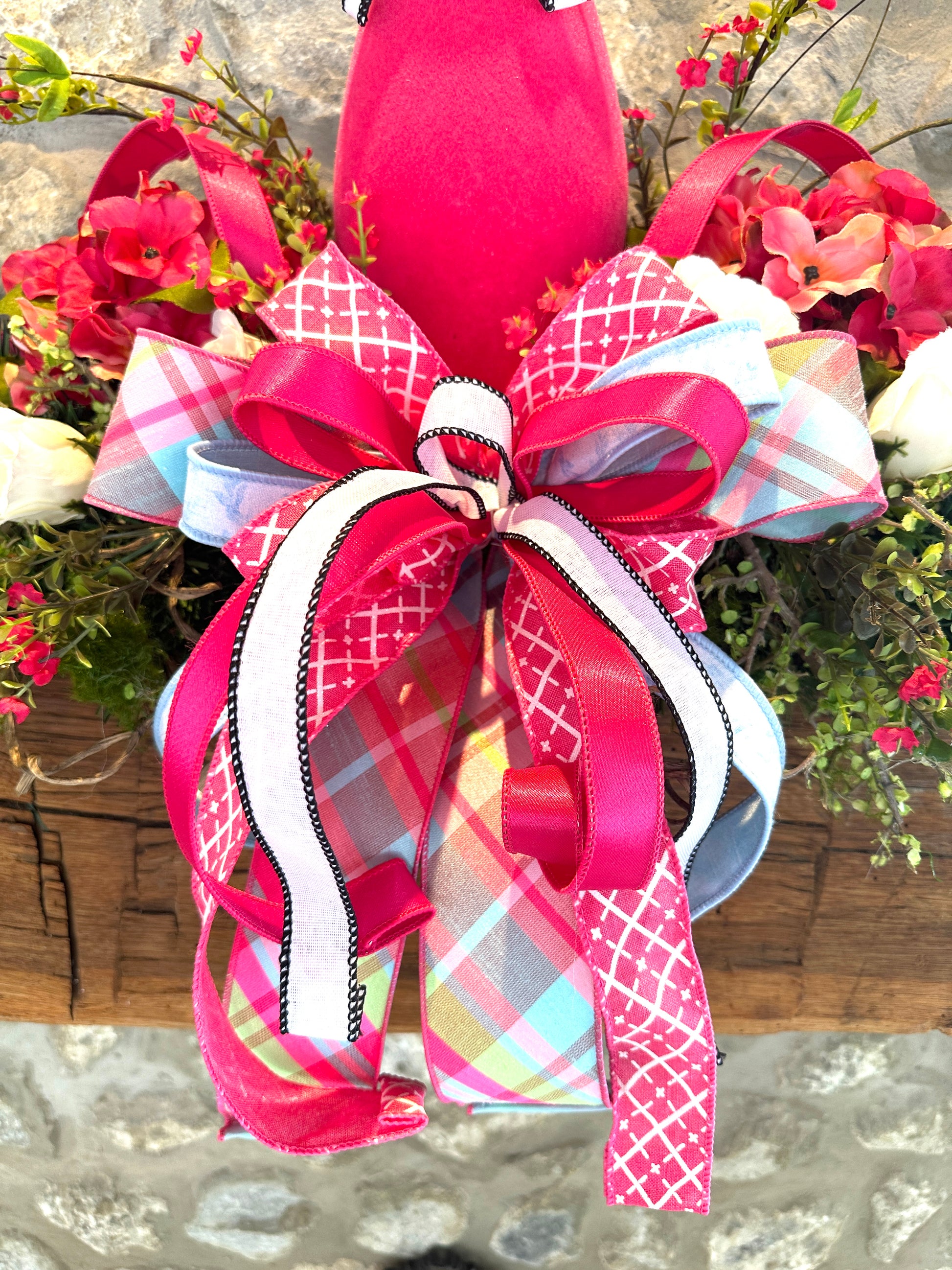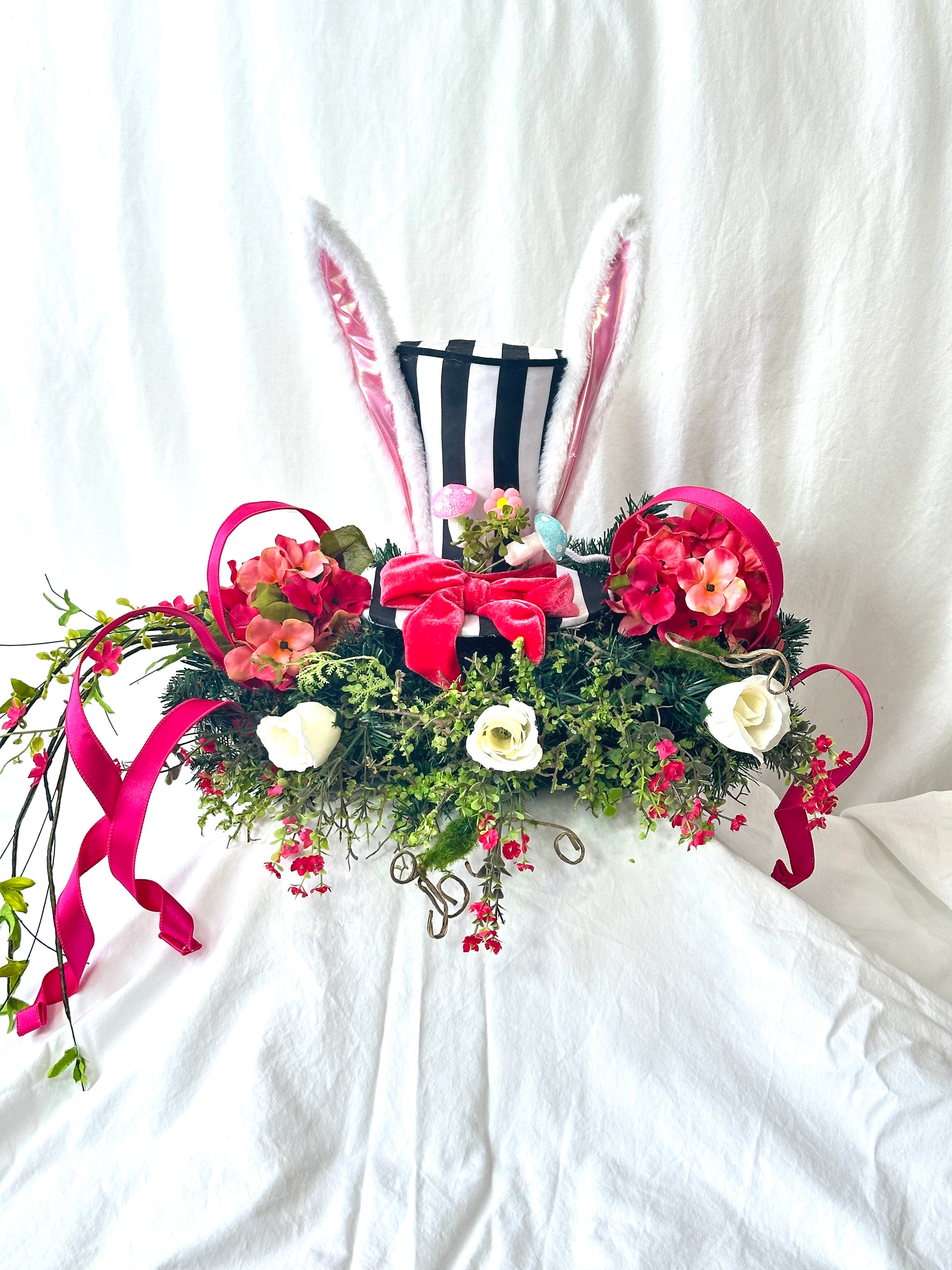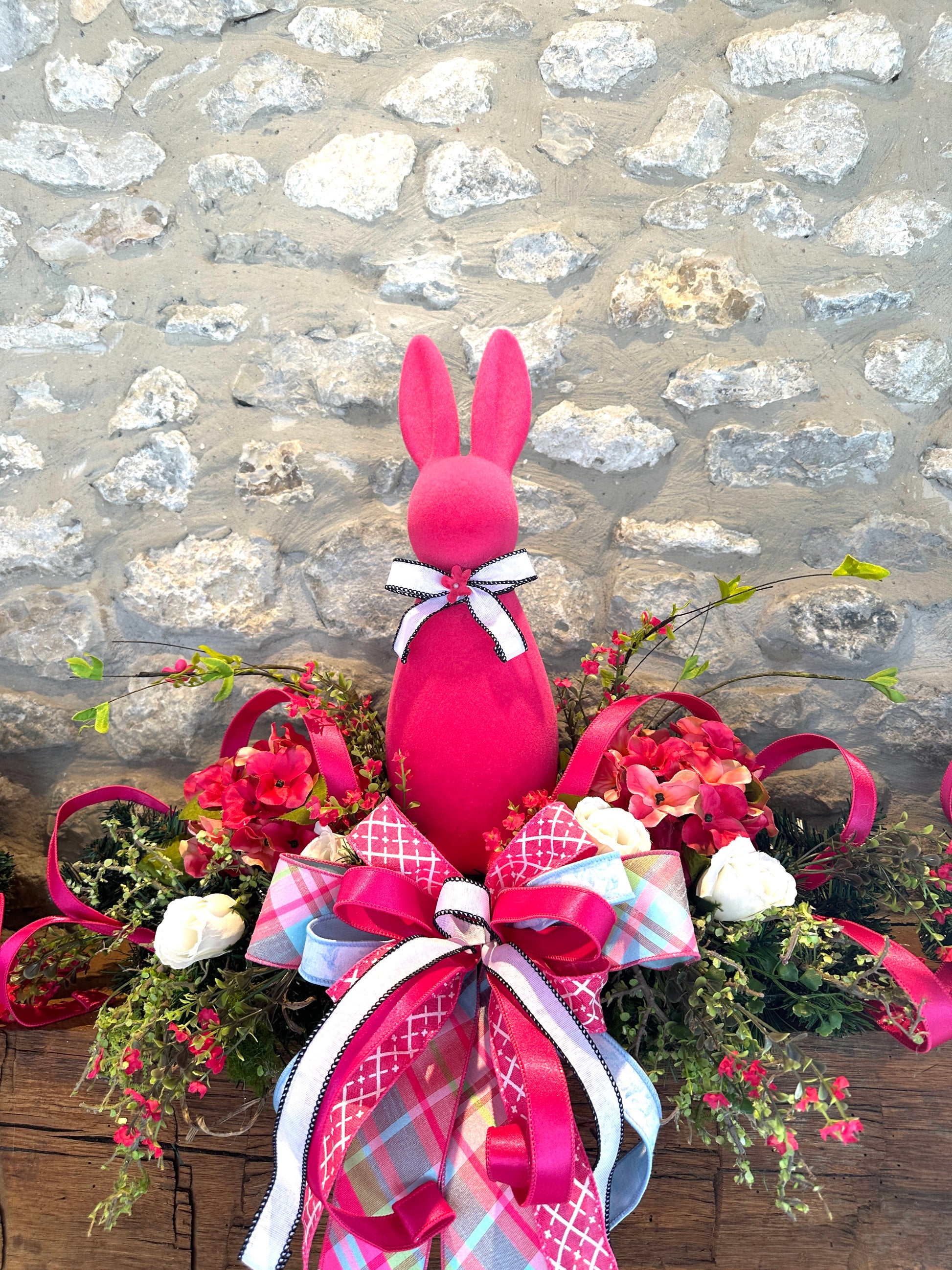 A center focal piece with a tall fuchsia bunny and layered ribbon bow